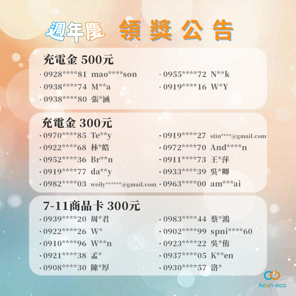 Acon-eco 週年慶充電活動,領獎公告出爐!看看誰是幸運兒!