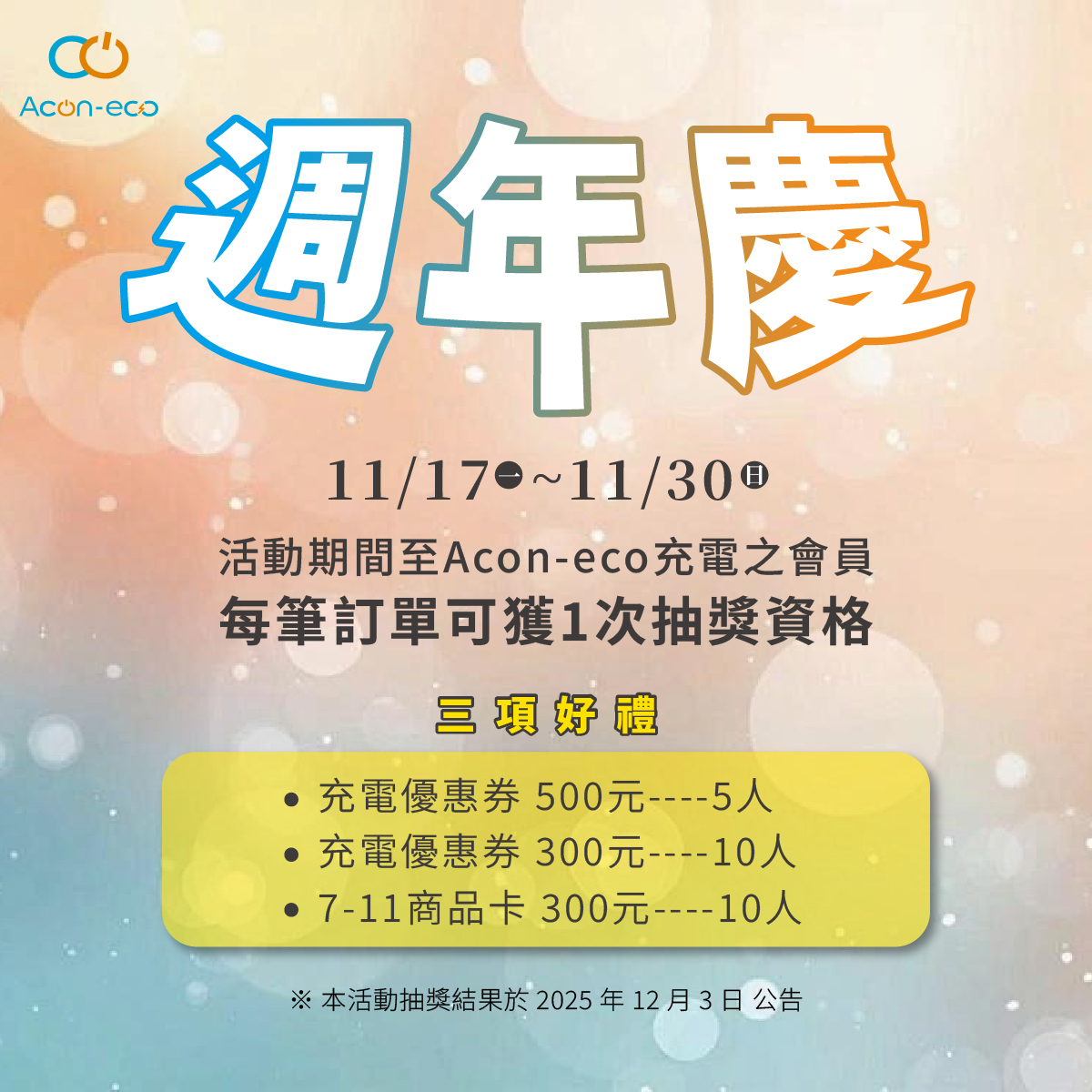 2. 得獎名單將於 2025/12/03 (三) 於APP、官網及粉絲專頁公告。優惠券於公告日後「3個工作日」內統一發放至得獎者之「ACON ECO」APP 帳號;7-11商品卡領獎手續需於2025/12/17 (三)前完成,逾期視同放棄領獎資格。
