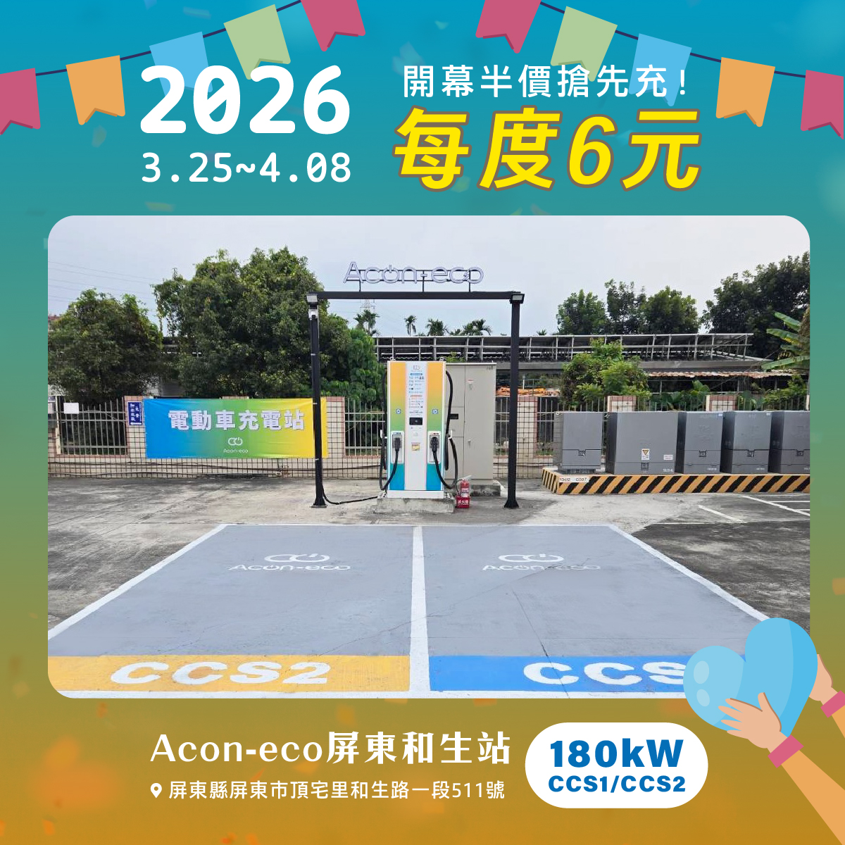 Acon-eco 連展電能攜手台糖加油站打造五站超級快充,打造新型態「複合式能源補給站」!首波於「高雄大社」及「屏東和生」開放充電,2026 年 3 月 25 日 至 2026 年 4 月 8 日期間,充電優惠半價(每度6元),讓您滿電上路!接下來陸續新增台糖超快充,敬請期待